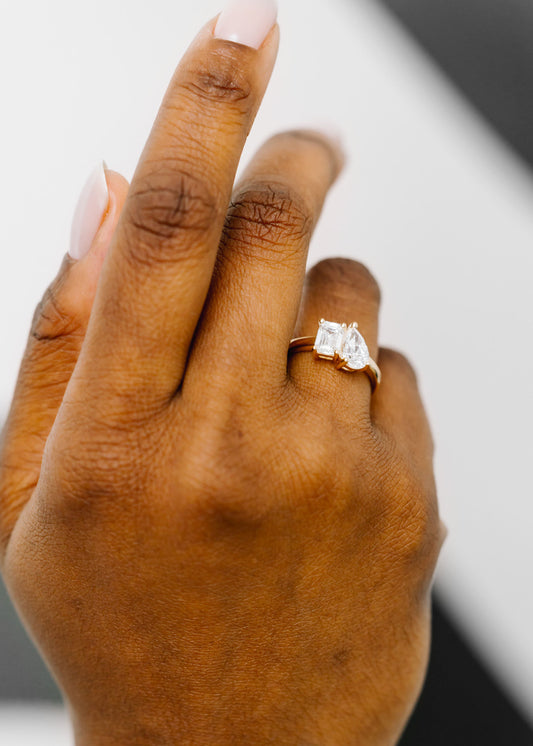 The Vela Ring | 1.03ct Lab-Grown Emerald Cut + 1.02ct Lab-Grown Pear | Yellow Gold