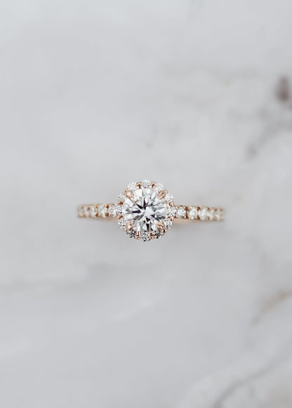 The halo-style ring is garnered with a 16 diamond pavè band that exudes class and confidence. With such a stunning diamond band, you have the ability to have a  unique diamond ring, with any stone you choose. You don’t have to choose between classic diamond and inspired gemstone, you can have it all with the Cordelia.