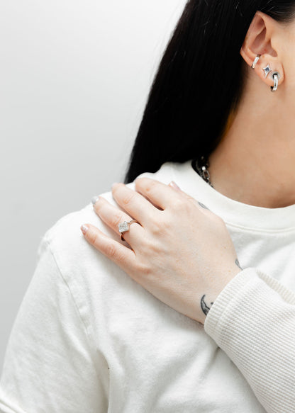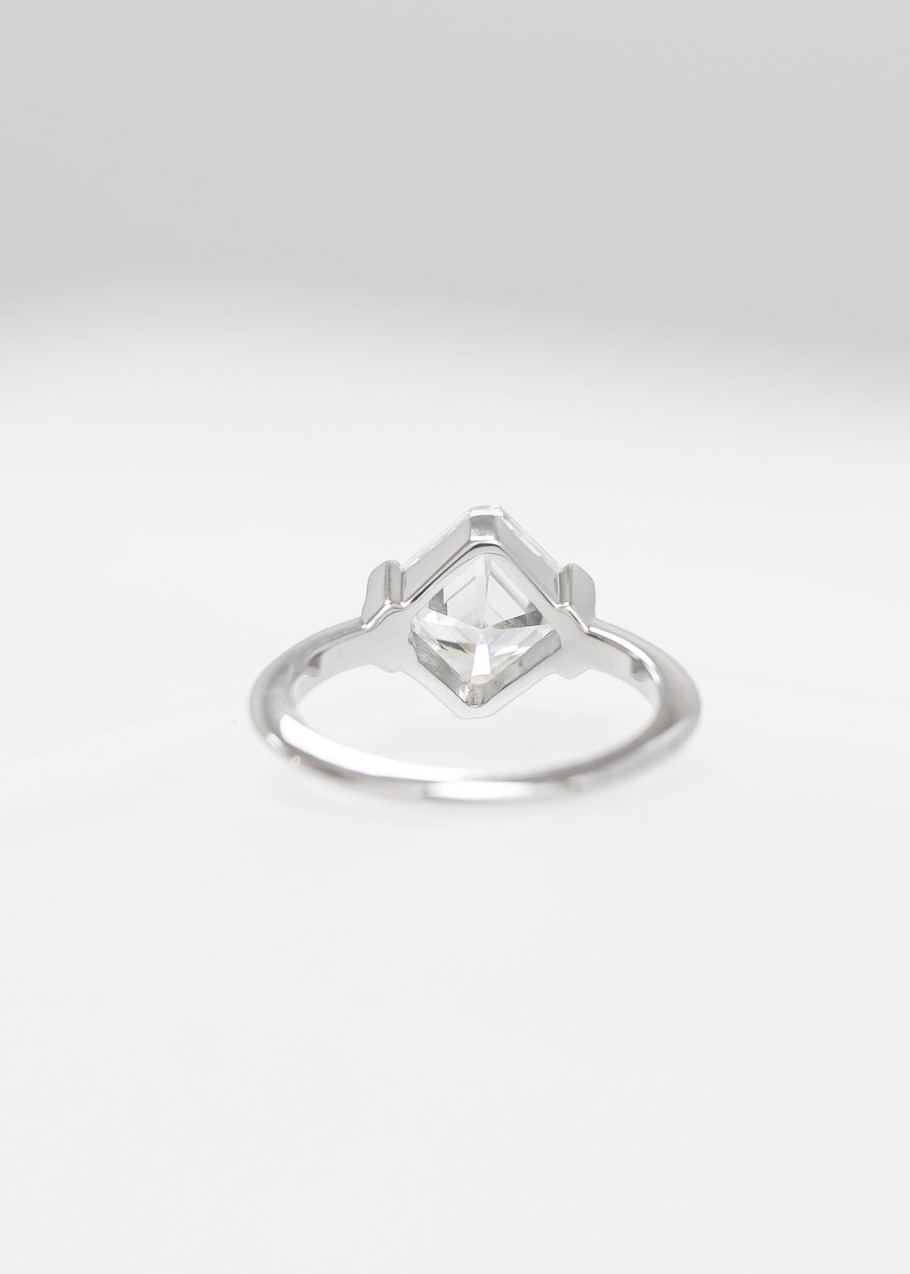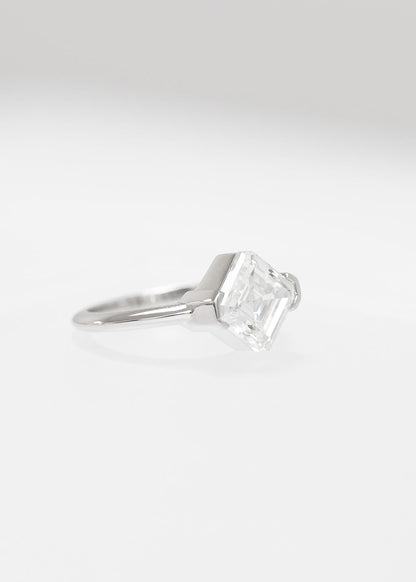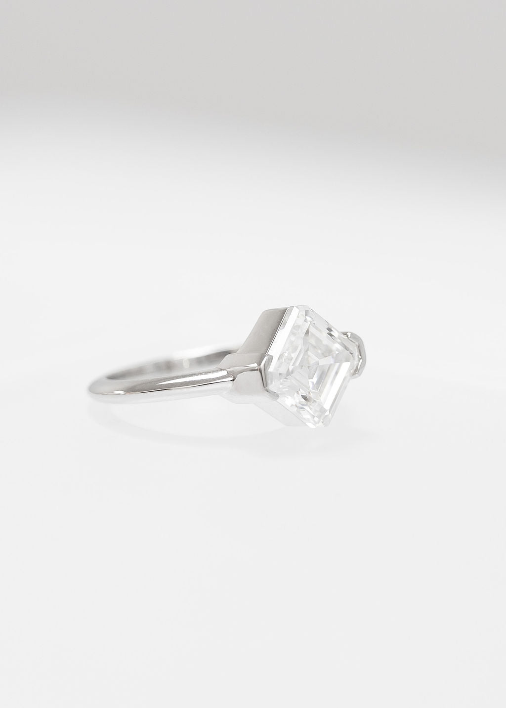 Minimalist yet bold, this 14K white gold ring features a striking 2.58-carat Asscher-cut moissanite, set in our signature Lyra setting with a partial bezel for a sleek, contemporary look. Designed as a gender-neutral engagement ring, this piece blends clean architectural lines with a refined modern aesthetic.