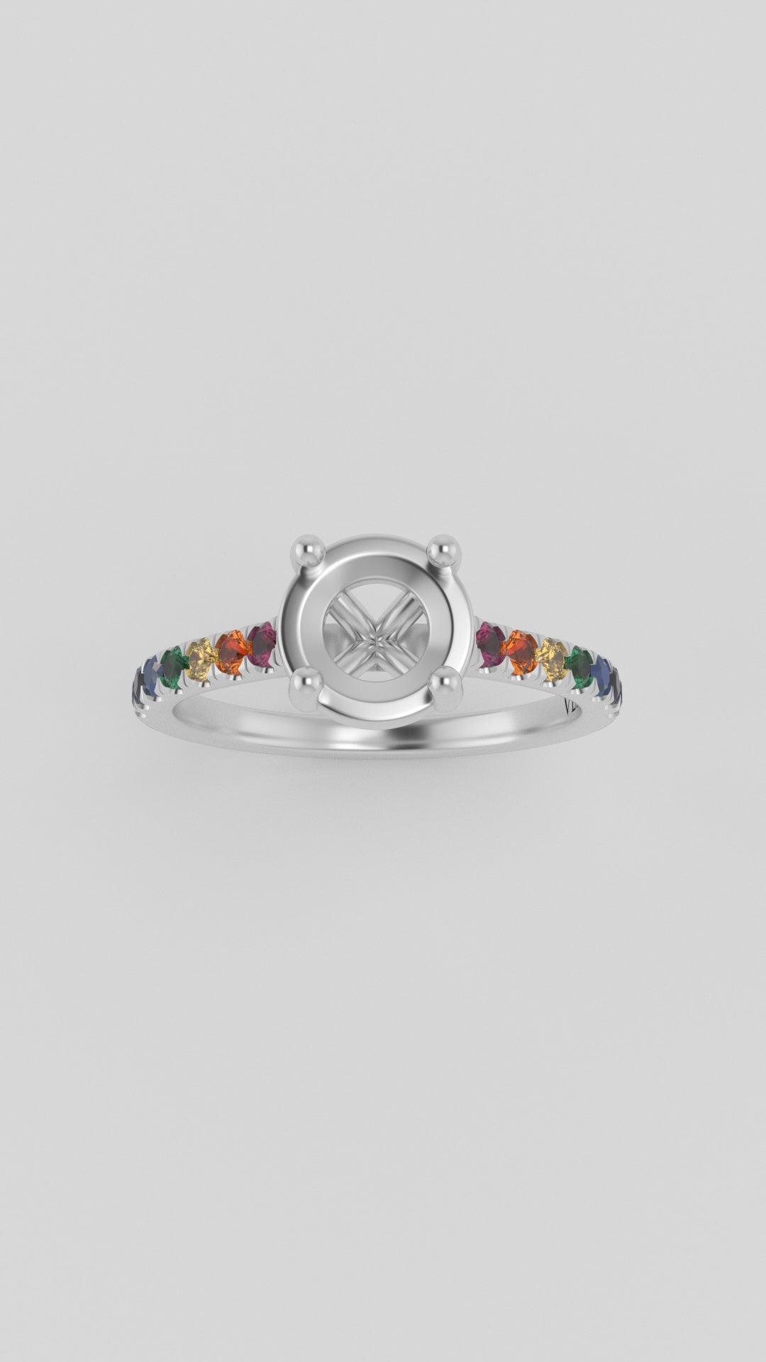 Let your pride flag fly! The Pride ring reminds us that love, ability, and self-expression exist on a spectrum. 16 multi-colored sapphires create a rainbow that hugs any cut or style of center stone. Pair the Pride with its companion band, the Joy, for an eye-catching double-rainbow effect.