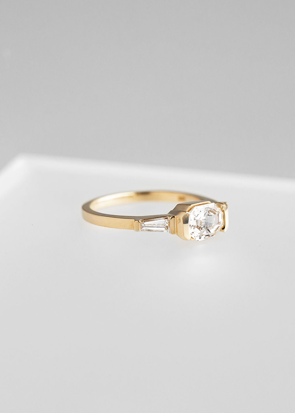Sleek and simple, the Wolfe is a contemporary engagement ring with an east-west set center stone. Crafted in 14k yellow gold, the Wolfe features a half-bezel set 1.07ct east-west octagon cut diamond center stone framed by two baguette cut diamonds. The Wolfe is a gender neutral engagement ring made to be worn by anyone.