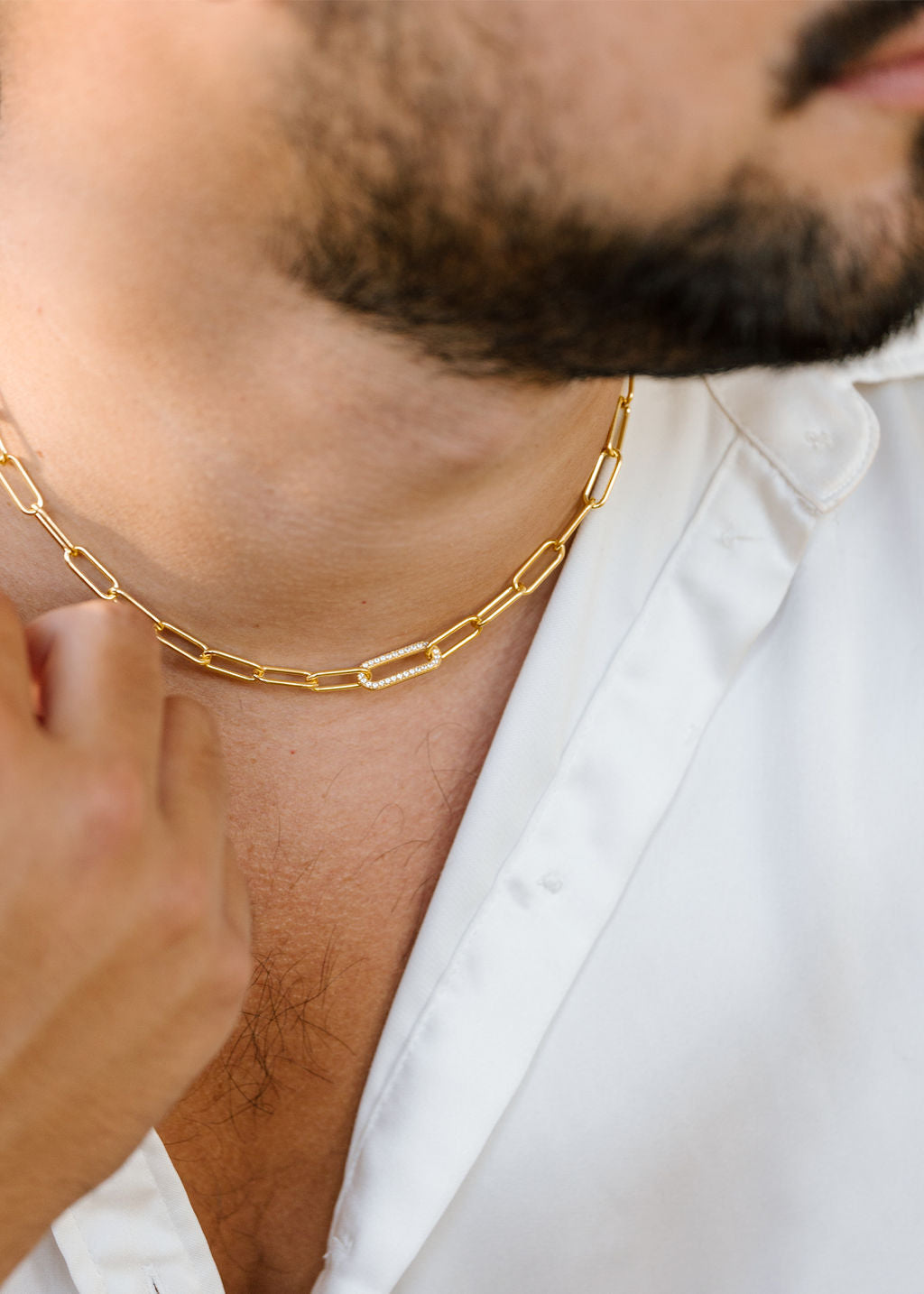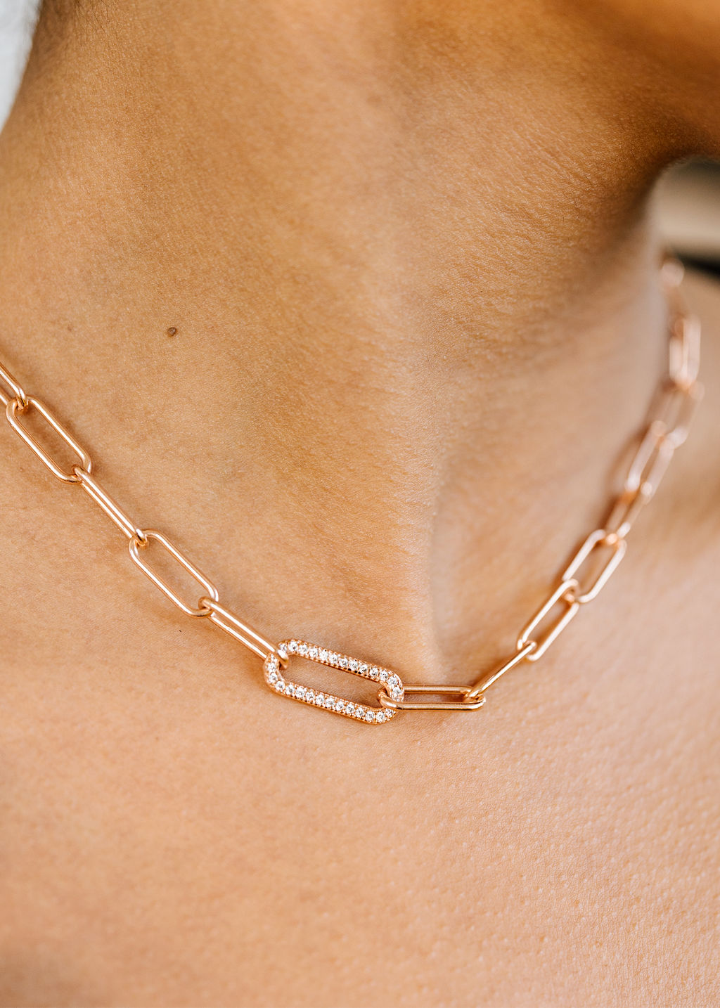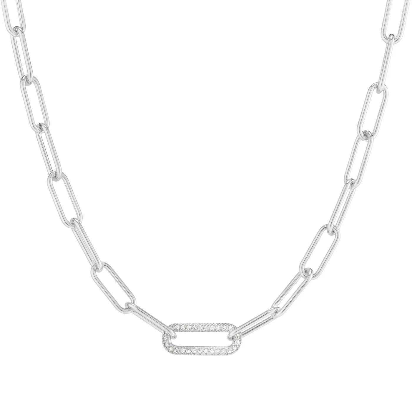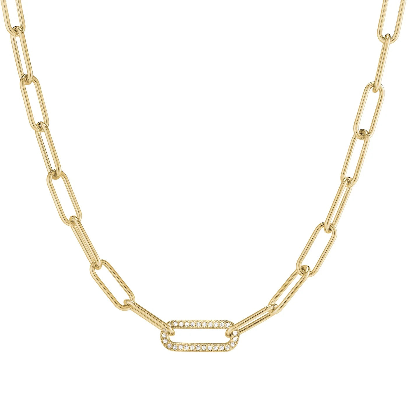 Make a statement with this bold paperclip necklace. The necklace features one link containing small simulated diamonds that add a touch of sparkle to the necklace. The paperclip design adds a modern twist to this timeless piece. The necklace is available in your choice of white, yellow or rose gold vermeil, perfect for any metal preference. The thick design of the paperclip makes it perfect for layering or wearing alone for a bold and elegant look.