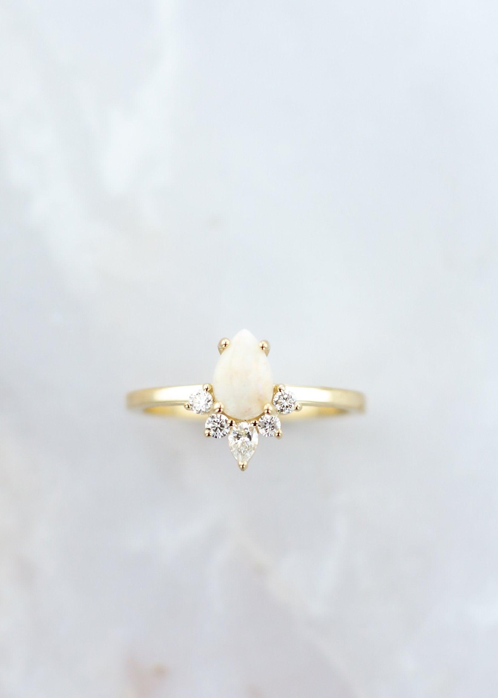 The Celeste will make you feel like the bubbly celestial being that you are. This vintage style engagement ring has a 5 stone sunburst that creates a bright and open look. Four of the stones are round and one is pear, making this piece a beautifully unique engagement ring. This unusual engagement ring is 1.5mm wide, and is available in long-lasting 14k white, yellow, or rose gold.