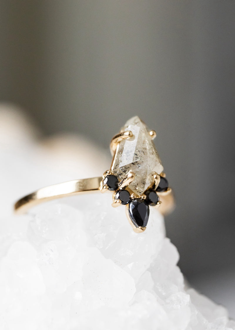 The Estelle has a beautiful five-black diamond sunburst; the four-round and singular pearl stone cushion your center stone of choice beautifully. You can decide to lean into the darkness and get a salt and pepper diamond or go bright with a brilliant gemstone. This ring allows you to live out your darkest fantasy and look good doing it.
