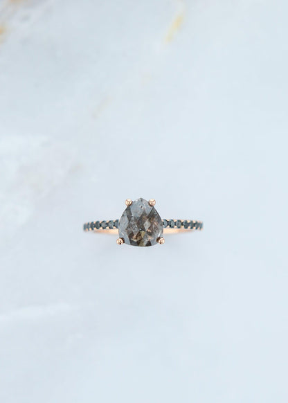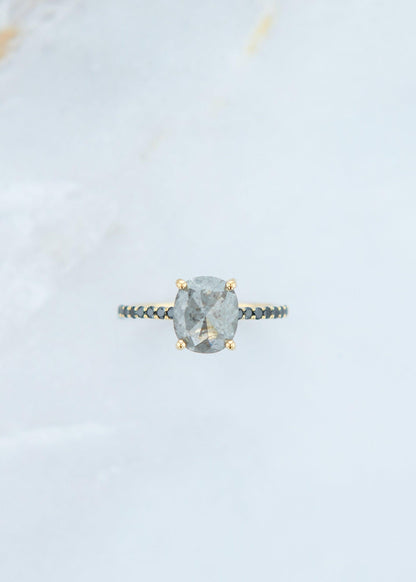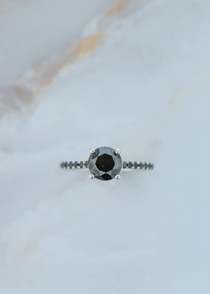 The Jett is a unique solitaire ring that knows which punk bands you listened to in middle school. This stunner is adorned with a 16 black diamond pave band, meaning you can still have a black diamond engagement ring no matter which stone you choose as your centerpiece.