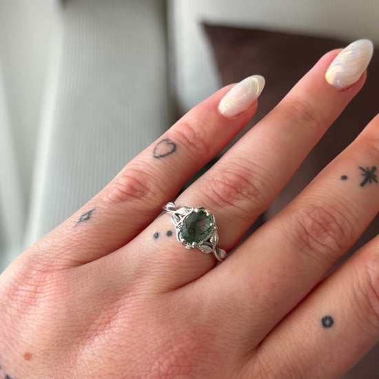 The moss agate's wispy green inclusions feel like frozen forest vines, giving this stone its signature one-of-a-kind look. Each gem is completely unique—no two moss agates will ever be the same. Nestled in an organic six-prong setting and surrounded by delicate hand-engraved leaves that wrap around the band, this ring captures the magic of the woods in wearable form.